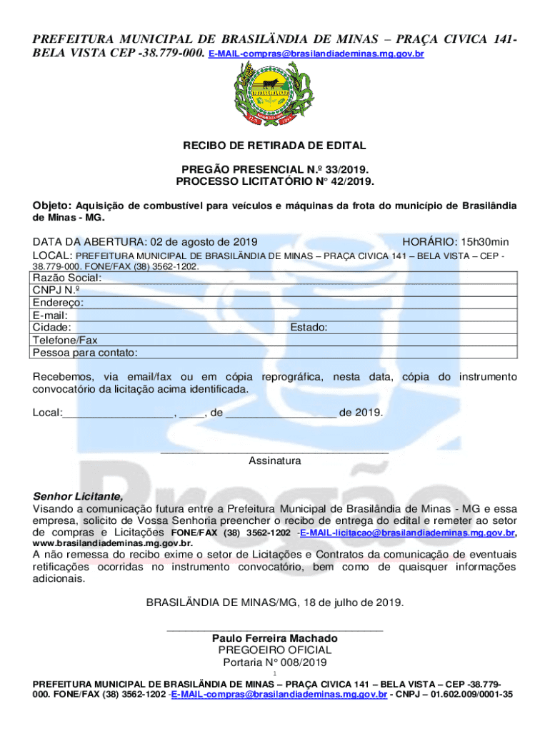 PREFEITURA MUNICIPAL DE BRASILNDIA DE MINASPRAA CIVICA 141BELA VISTA CEP 38.779000. EMAILcompras@brasilandiademinas.mg.gov.brRECIBO DE RETIRADA DE EDITAL PREGO PRESENCIAL N. 33/2019. PROCESSO LICITATRIO