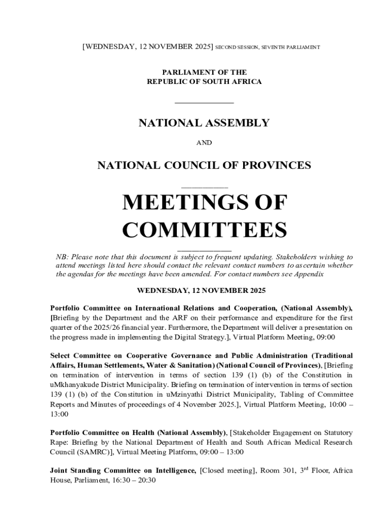 [WEDNESDAY, 12 NOVEMBER 2025] SECOND SESSION, SEVENTH PARLIAMENT PARLIAMENT OF THE REPUBLIC OF SOUTH AFRICA ___NATIONAL ASSEMBLY ANDNATIONAL COUNCIL OF PROVINCES ___MEETINGS OF COMMITTEES ___NB: Please