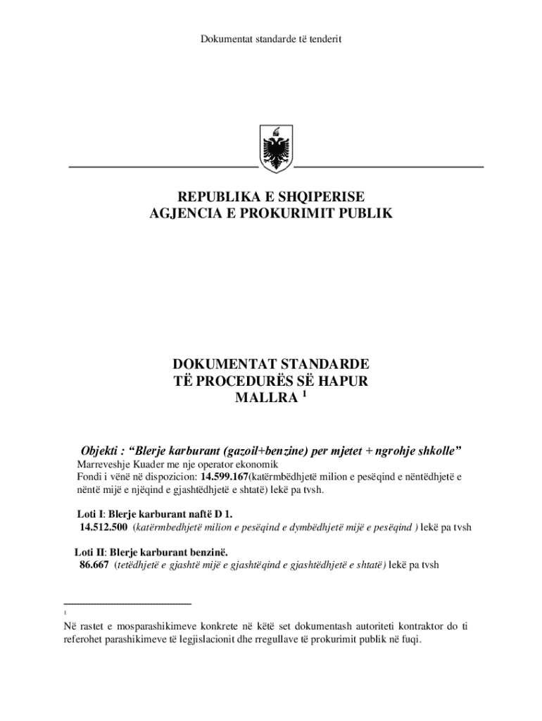 Dokumentat standarde t tenderitREPUBLIKA E SHQIPERISE AGJENCIA E PROKURIMIT PUBLIKDOKUMENTAT STANDARDE T PROCEDURS S HAPUR MALLRA 1Objekti : Blerje karburant (gazoil+benzine) per mjetet + ngrohje