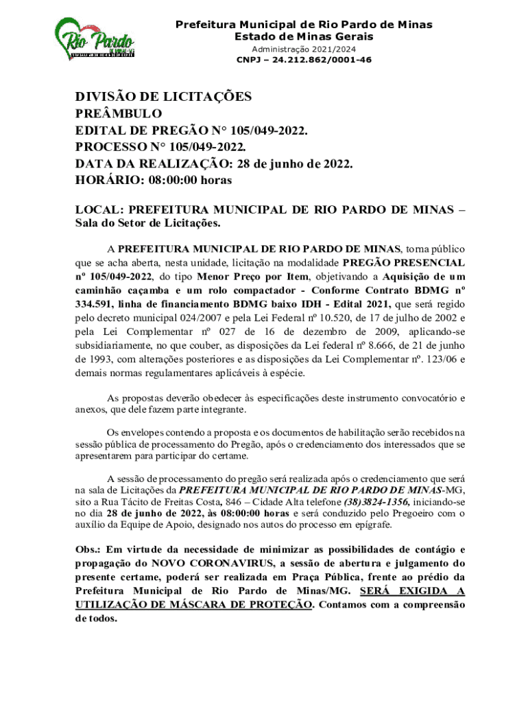 Obtenha o gratuito n 105/049-2022, do tipo Menor Preo por Item, objetivando a Aquisio de um