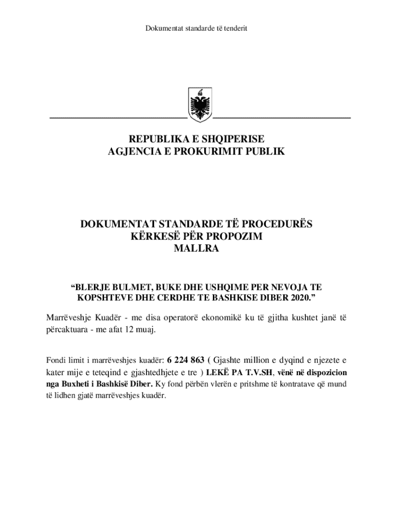 Dokumentat standarde t tenderitREPUBLIKA E SHQIPERISE AGJENCIA E PROKURIMIT PUBLIKDOKUMENTAT STANDARDE T PROCEDURS KRKES PR PROPOZIM MALLRABLERJE BULMET, BUKE DHE USHQIME PER NEVOJA TE KOPSHTEVE DHE