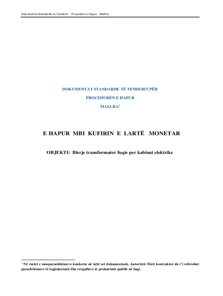 Dokumenta Standarde te TenderitProcedure e HapurMallraDOKUMENTAT STANDARDE T TENDERIT PR PROCEDURN E HAPUR MALLRA1E HAPUR MBI KUFIRIN E LART MONETAROBJEKTI: Blerje transformator fuqie per kabinat