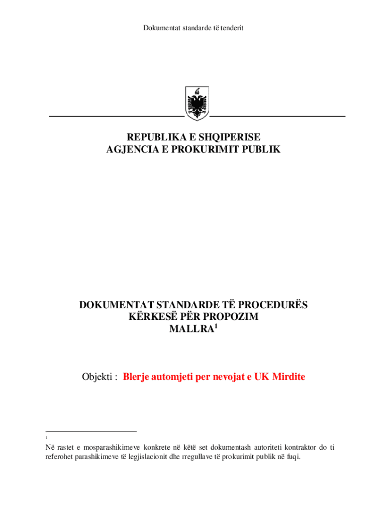 Dokumentat standarde t tenderitREPUBLIKA E SHQIPERISE AGJENCIA E PROKURIMIT PUBLIKDOKUMENTAT STANDARDE T PROCEDURS KRKES PR PROPOZIM MALLRA1Objekti : Blerje automjeti per nevojat e UK Mirdite1N rastet