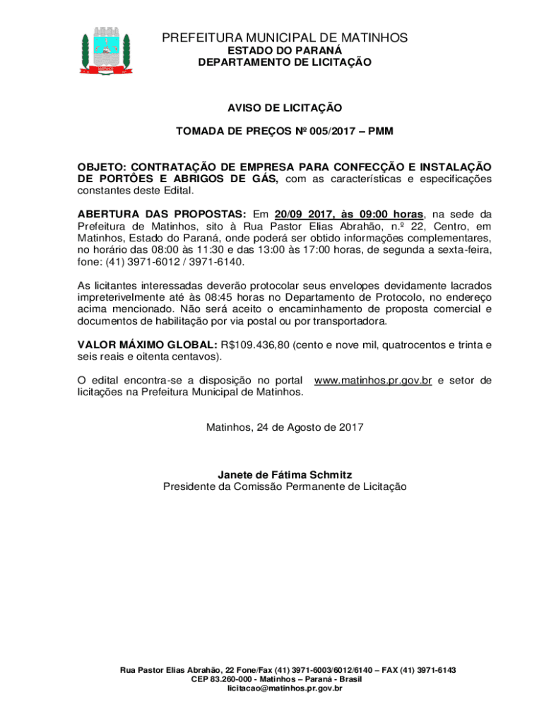 PREFEITURA MUNICIPAL DE MATINHOS ESTADO DO PARAN DEPARTAMENTO DE LICITAOAVISO DE LICITAO TOMADA DE PREOS N 005/2017PMMOBJETO: CONTRATAO DE EMPRESA PARA CONFECO E INSTALAO DE PORTES E ABRIGOS DE GS,