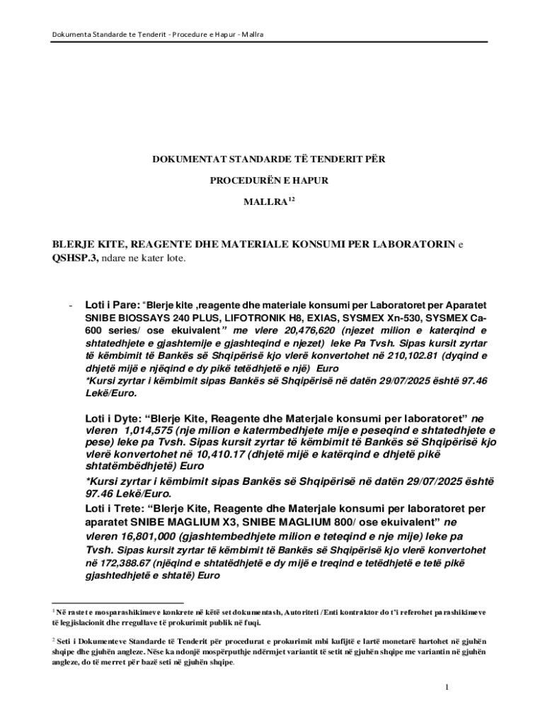 Dokumenta Standarde te TenderitProcedure e HapurMallraDOKUMENTAT STANDARDE T TENDERIT PR PROCEDURN E HAPUR MALLRA12BLERJE KITE, REAGENTE DHE MATERIALE KONSUMI PER LABORATORIN e QSHSP.3, ndare ne kater