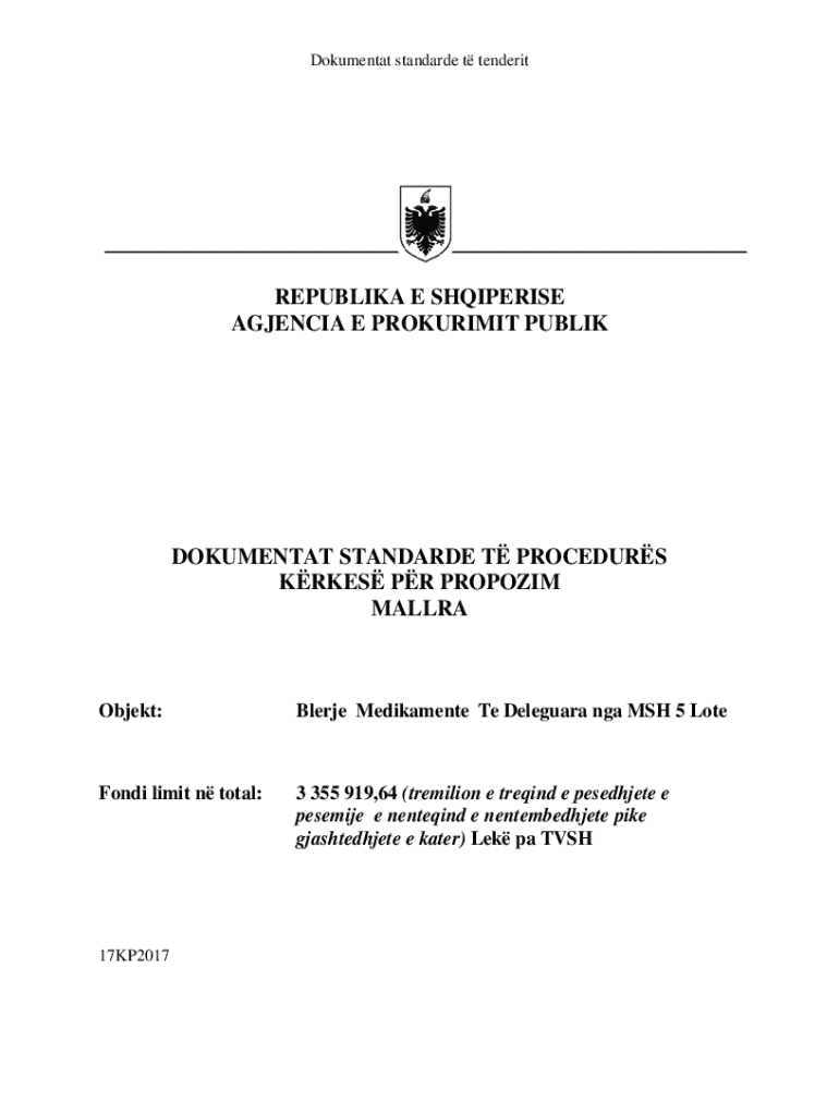 Dokumentat standarde t tenderitREPUBLIKA E SHQIPERISE AGJENCIA E PROKURIMIT PUBLIKDOKUMENTAT STANDARDE T PROCEDURS KRKES PR PROPOZIM MALLRAObjekt:Blerje Medikamente Te Deleguara nga MSH 5 LoteFondi
