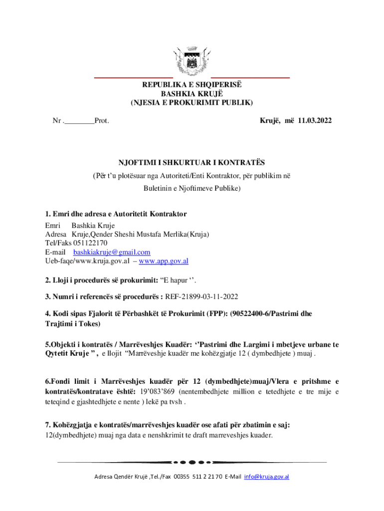 ______REPUBLIKA E SHQIPERIS BASHKIA KRUJ (NJESIA E PROKURIMIT PUBLIK) Nr .___Prot.Kruj, m 11.03.2022NJOFTIMI I SHKURTUAR I KONTRATS (Pr tu plotsuar nga Autoriteti/Enti Kontraktor, pr publikim n Buletinin