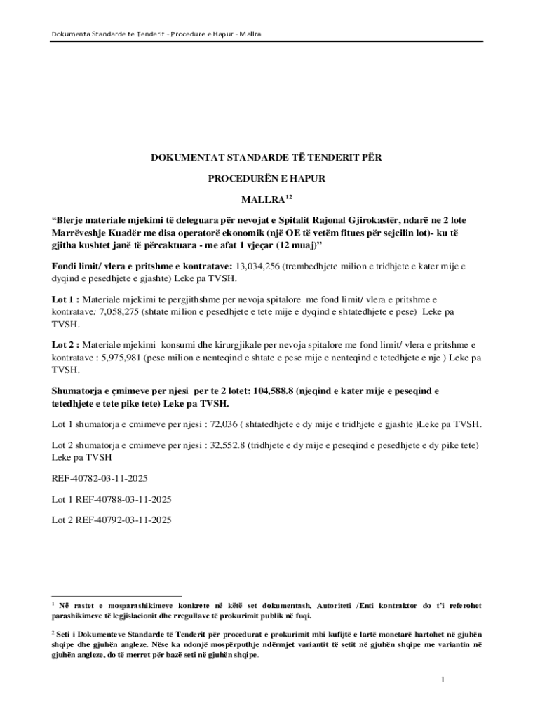 Dokumenta Standarde te TenderitProcedure e HapurMallraDOKUMENTAT STANDARDE T TENDERIT PR PROCEDURN E HAPUR MALLRA12 Blerje materiale mjekimi t deleguara pr nevojat e Spitalit Rajonal Gjirokastr, ndar