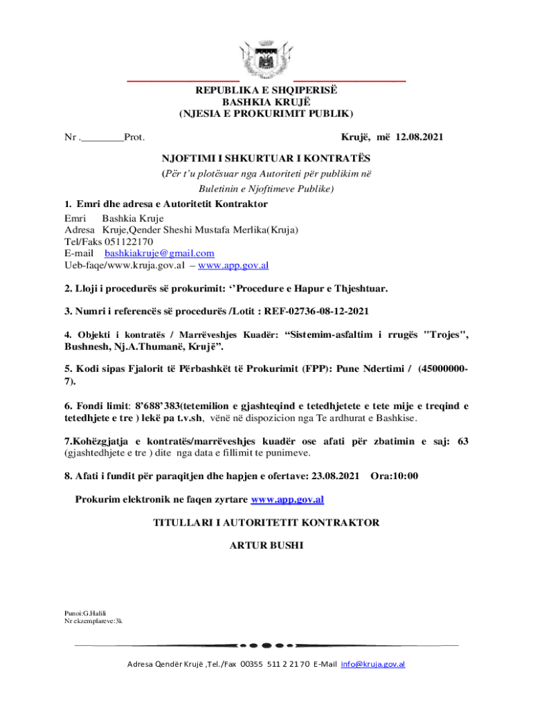 ______REPUBLIKA E SHQIPERIS BASHKIA KRUJ (NJESIA E PROKURIMIT PUBLIK) Nr .___Prot.Kruj, m 12.08.2021NJOFTIMI I SHKURTUAR I KONTRATS (Pr tu plotsuar nga Autoriteti pr publikim n Buletinin e Njoftimeve