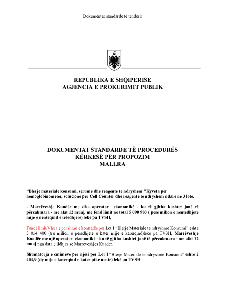 Dokumentat standarde t tenderitREPUBLIKA E SHQIPERISE AGJENCIA E PROKURIMIT PUBLIKDOKUMENTAT STANDARDE T PROCEDURS KRKES PR PROPOZIM MALLRABlerje materiale konsumi, serume dhe reagente te ndryshem