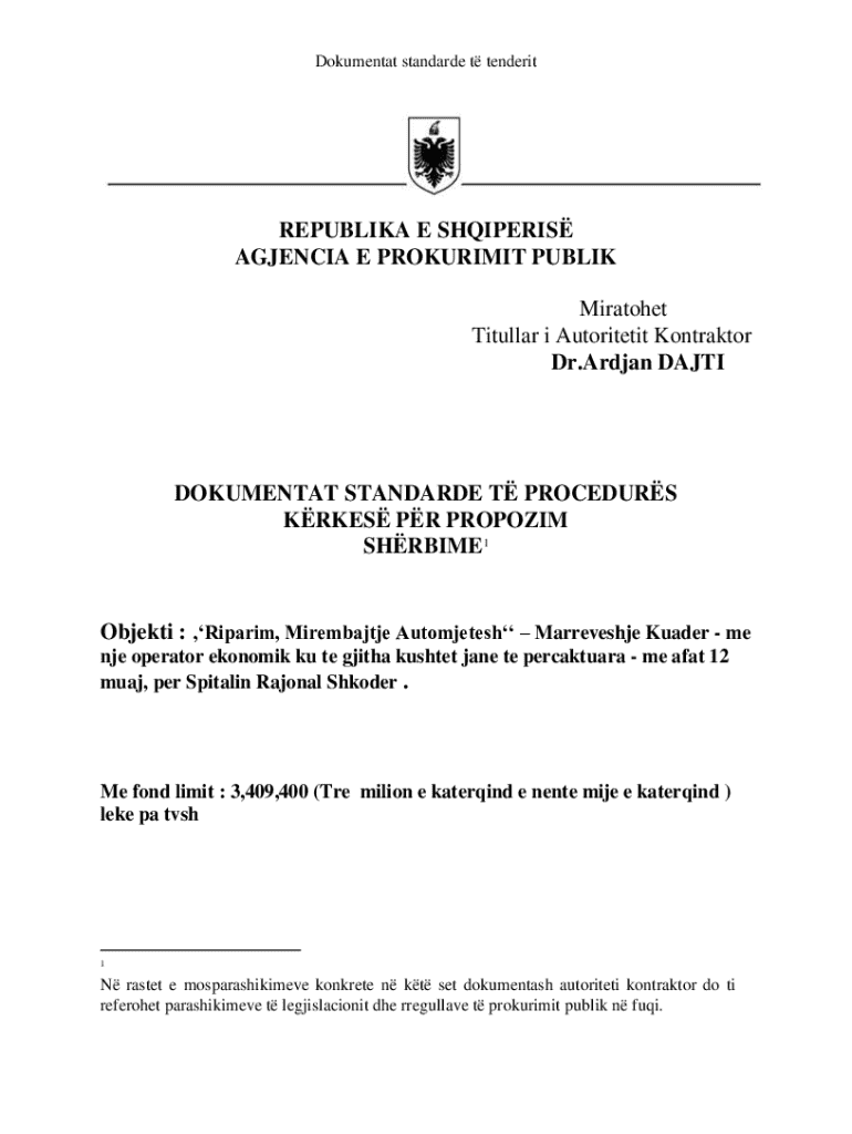 Dokumentat standarde t tenderitREPUBLIKA E SHQIPERIS AGJENCIA E PROKURIMIT PUBLIK Miratohet Titullar i Autoritetit Kontraktor Dr.Ardjan DAJTIDOKUMENTAT STANDARDE T PROCEDURS KRKES PR PROPOZIM SHRBIME1Objekti
