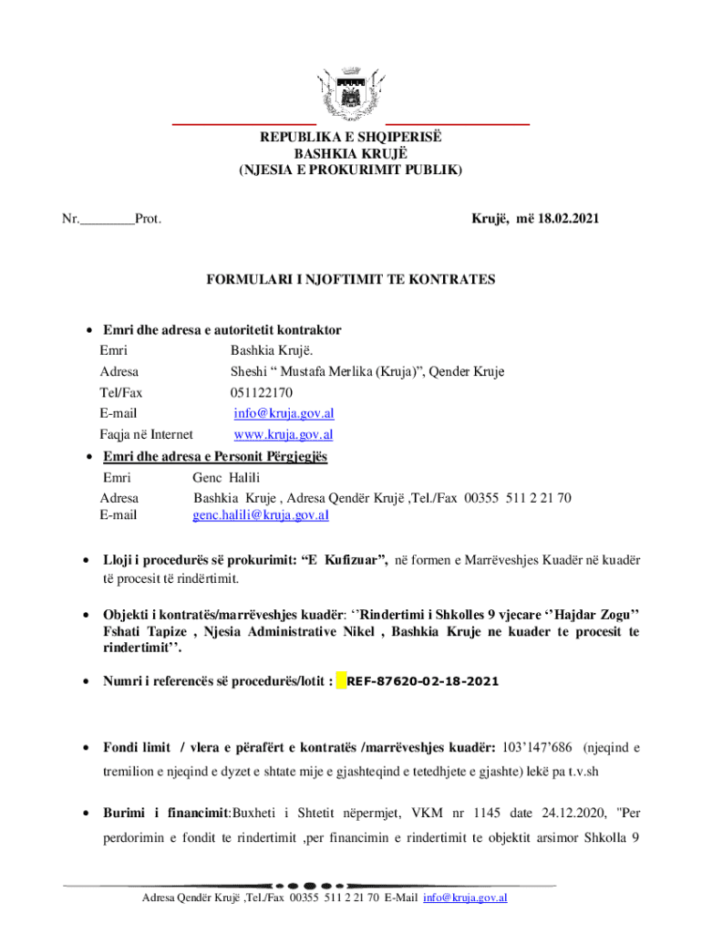 ______REPUBLIKA E SHQIPERIS BASHKIA KRUJ (NJESIA E PROKURIMIT PUBLIK)Nr.___Prot.Kruj, m 18.02.2021FORMULARI I NJOFTIMIT TE KONTRATESEmri dhe adresa e autoritetit kontraktor Emri Bashkia Kruj. Adresa
