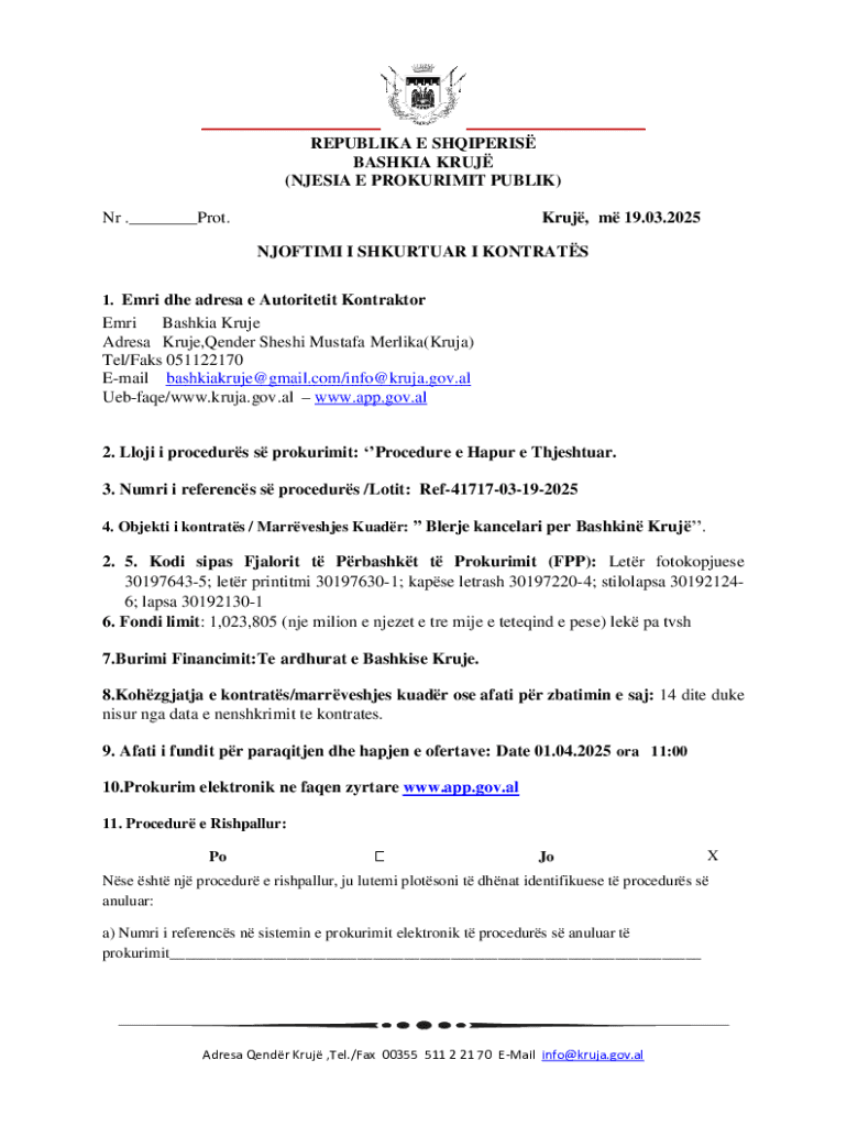 ______REPUBLIKA E SHQIPERIS BASHKIA KRUJ (NJESIA E PROKURIMIT PUBLIK) Nr .___Prot.Kruj, m 19.03.2025 NJOFTIMI I SHKURTUAR I KONTRATS1. Emri dhe adresa e Autoritetit KontraktorEmri Bashkia Kruje Adresa