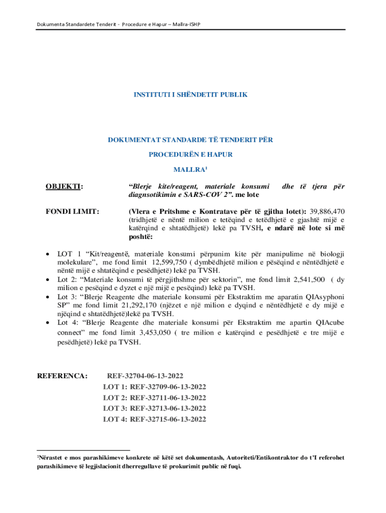 Dokumenta Standardete TenderitProcedure e HapurMallraISHPINSTITUTI I SHNDETIT PUBLIKDOKUMENTAT STANDARDE T TENDERIT PR PROCEDURN E HAPUR MALLRA1OBJEKTI:Blerje kite/reagent, materiale konsumi diagnsotikimin