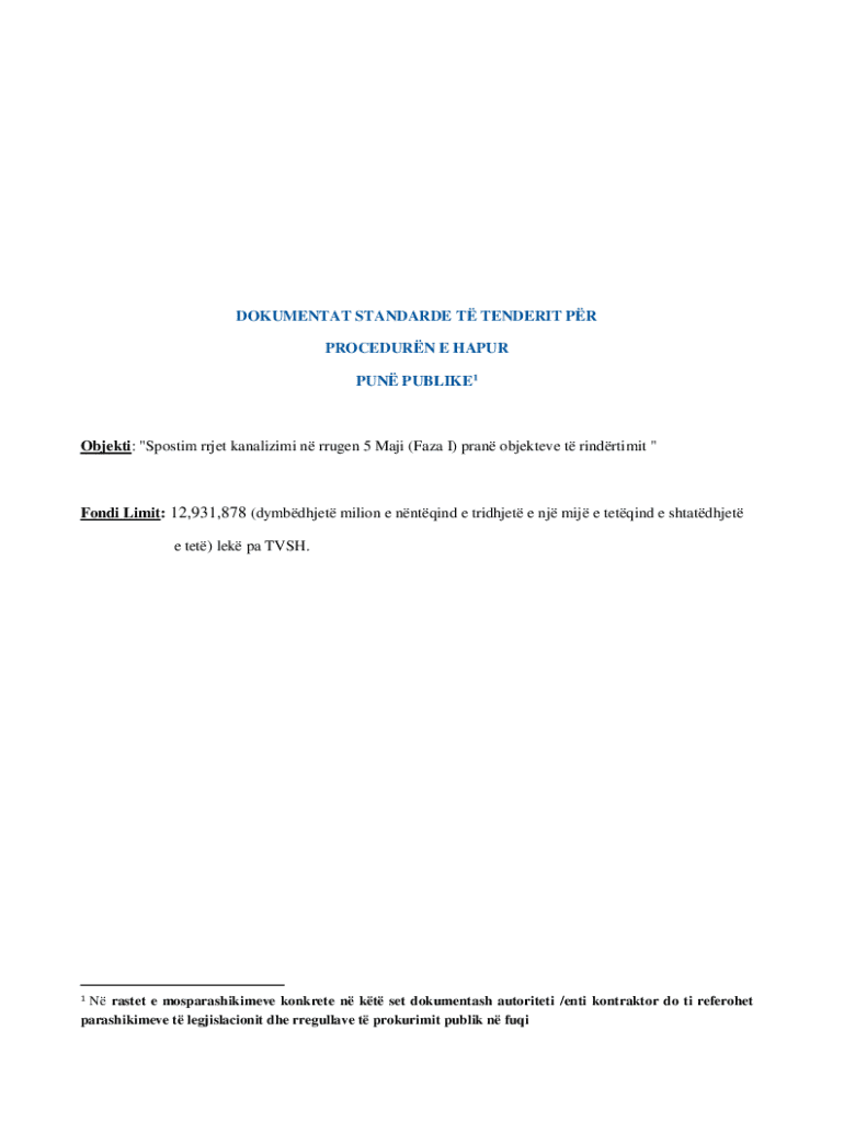 DOKUMENTAT STANDARDE T TENDERIT PR PROCEDURN E HAPUR PUN PUBLIKE1Objekti: \"Spostim rrjet kanalizimi n rrugen 5 Maji (Faza I) pran objekteve t rindrtimit \"Fondi Limit: 12,931,878 (dymbdhjet milion
