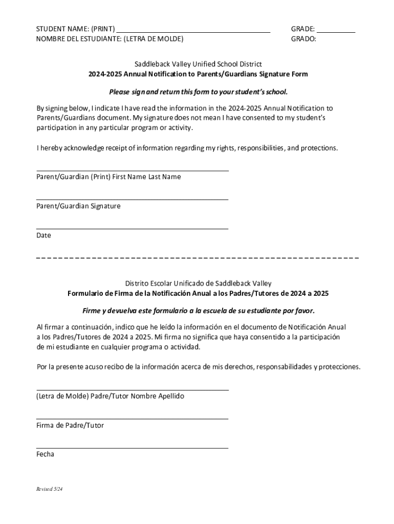 STUDENT NAME: (PRINT) ___ NOMBRE DEL ESTUDIANTE: (LETRA DE MOLDE)GRADE: ___ GRADO:Saddleback Valley Unified School District 20242025 Annual Notification to Parents/Guardians Signature Form Please