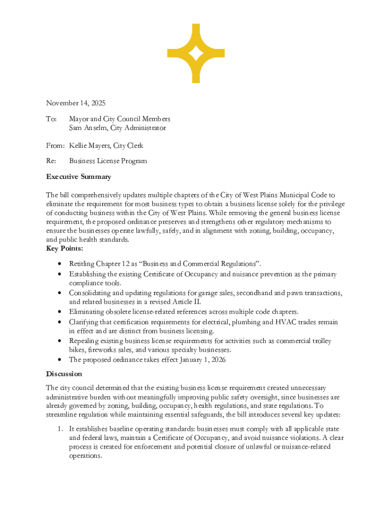 Get the free November 14, 2025 To: Mayor and City Council Members Sam ...