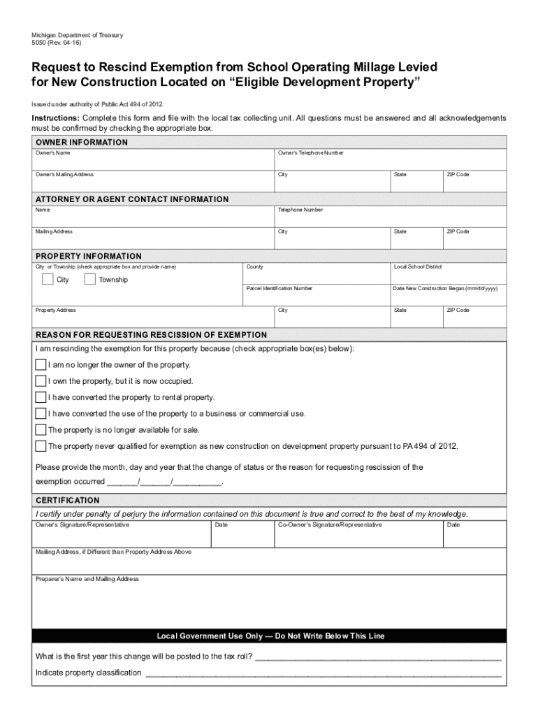 Reset FormMichigan Department of Treasury 5050 (Rev. 0416)Request to Rescind Exemption from School Operating Millage Levied for New Construction Located on Eligible Development Property Issued under