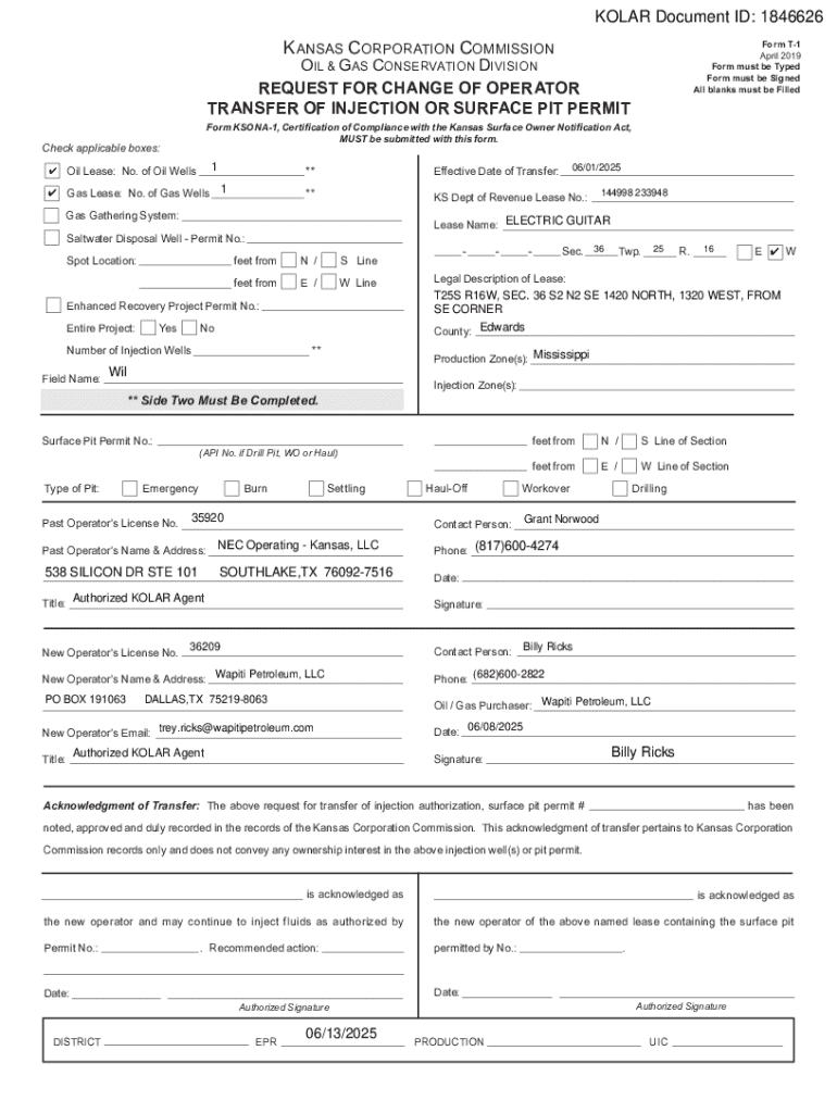 KOLAR Document ID: 1846626K ANSAS CORPORATION COMMISSIONForm T1 April 2019 Form must be Typed Form must be Signed All blanks must be FilledOIL & GAS CONSERVATION DIVISION REQUEST FOR CHANGE OF OPERATOR