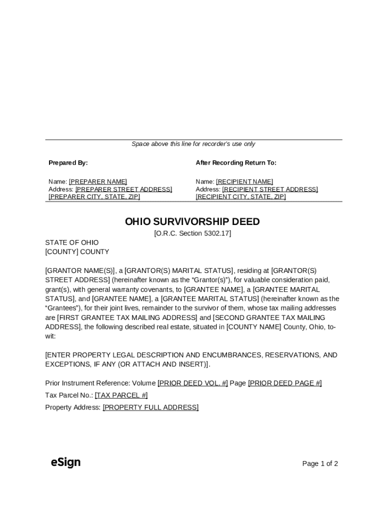 A survivorship deed in Ohio is a vital legal document used to ensure that property automatically passes to surviving owners upon the death of one owner. This arrangement plays a significant role in estate planning, allowing for a seamless transition of property ownership without the need for probate. In Ohio, the legal framework governing survivorship deeds falls under the Revised Code, specifically section 5302.20, which outlines how property can be jointly owned and transferred upon death.