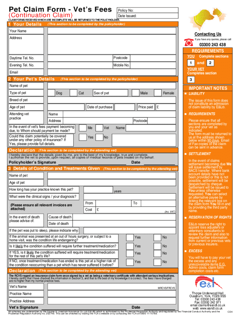 Pet Claim FormVets FeesPolicy No: Date Issued:(Continuation Claim)CLAIM FORMS RECEIVED WHICH ARE INCOMPLETE WILL BE RETURNED TO THE POLICYHOLDER.1 Your Details(This section to be completed by the