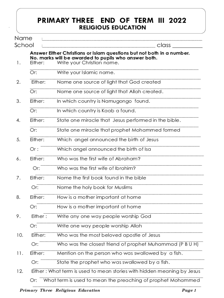 PRIMARY THREE END OF TERM III 2022 RELIGIOUS EDUCATIONName School 1.2.3.4.5.6.7.8.9.10.11.12.:___ :___ class ___Answer Either Christians or Islam questions but not both in a number. No. marks will