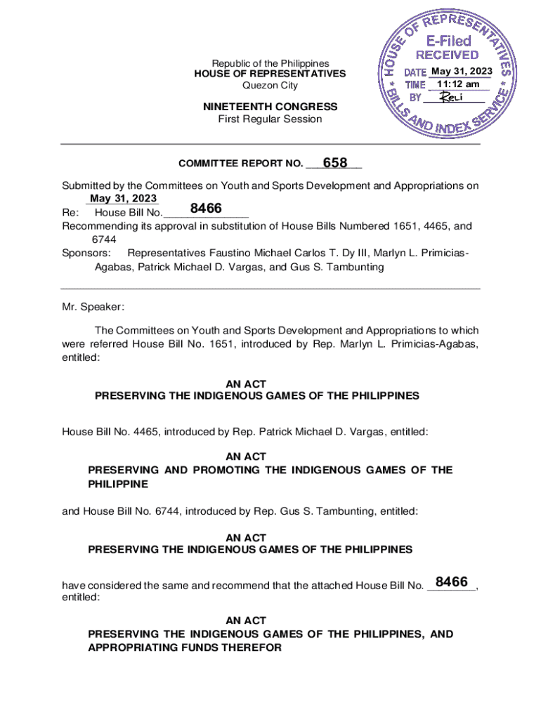 Republic of the Philippines HOUSE OF REPRESENTATIVES Quezon CityMay 31, 2023 11:12 amNINETEENTH CONGRESS First Regular SessionCOMMITTEE REPORT NO. ___ 658Submitted by the Committees on Youth and Sports
