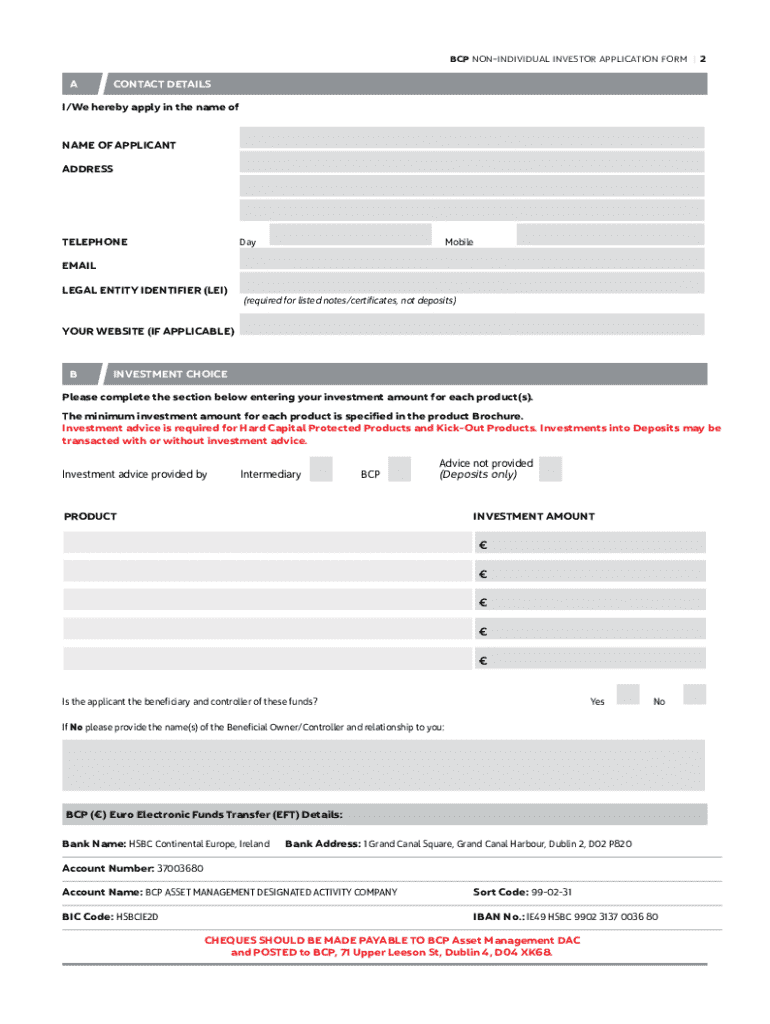 A non-individual investor form is a crucial document intended for entities such as corporations, partnerships, and trusts that are seeking to invest in various markets. This form serves to collect essential information regarding the entity's identity, investment intent, and legal representatives. Correctly completing this form is vital for compliance with regulatory requirements, safeguarding the integrity of investments, and ensuring proper accountability.