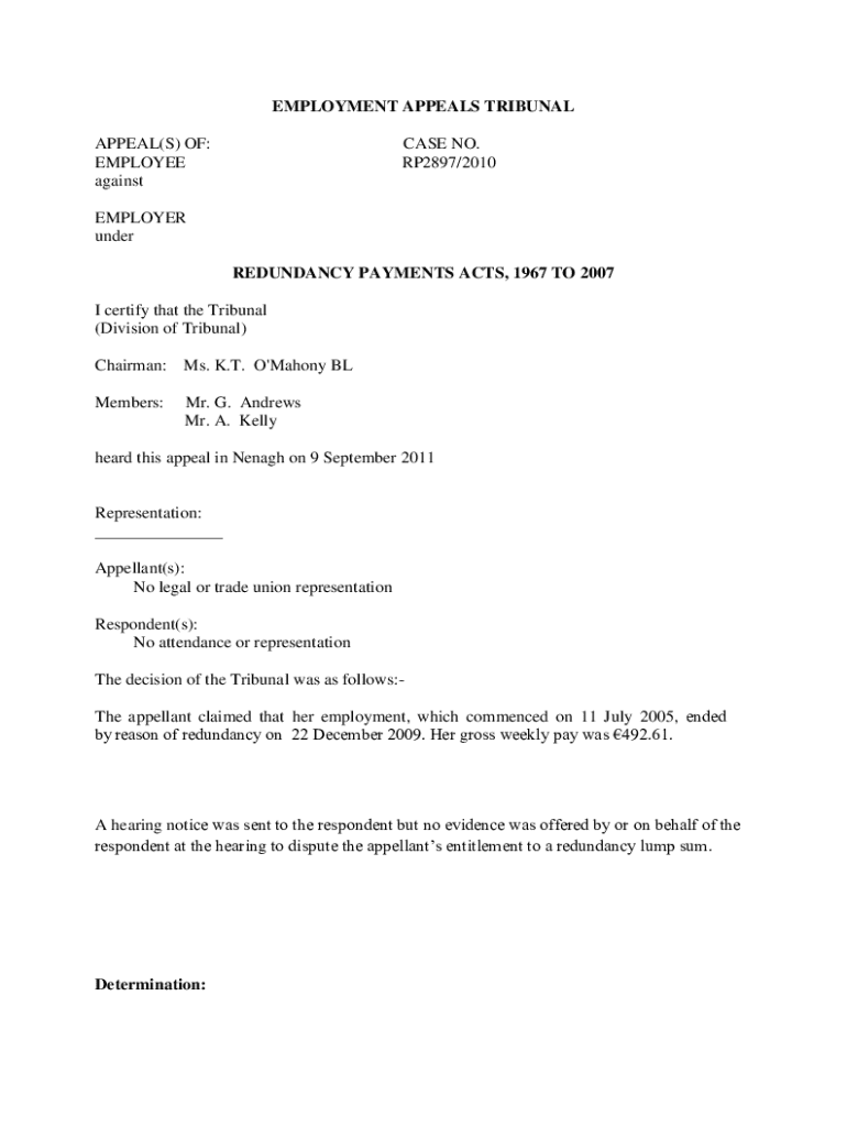 EMPLOYMENT APPEALS TRIBUNAL APPEAL(S) OF: EMPLOYEE againstCASE NO. RP2897/2010EMPLOYER under REDUNDANCY PAYMENTS ACTS, 1967 TO 2007 I certify that the Tribunal (Division of Tribunal) Chairman:Ms.