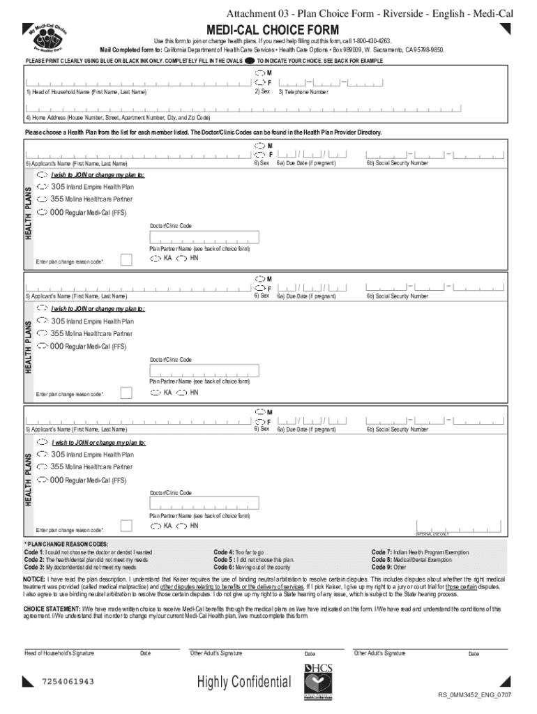 Attachment 03Plan Choice FormRiversideEnglishMediCalMEDICAL CHOICE FORMUse this form to join or change health plans. If you need help filling out this form, call 18004304263. Mail Completed form to: