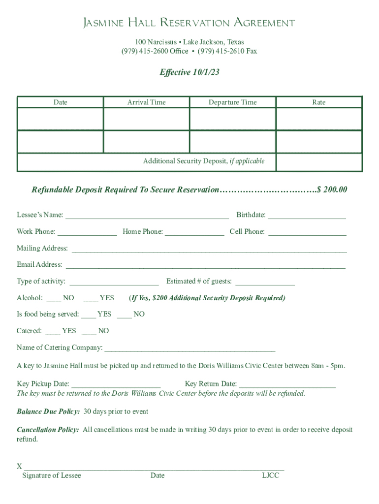 Jasmine Hall Reservation Agreement 100 NarcissusLake Jackson, Texas (979) 4152600 Office(979) 4152610 FaxEffective 10/1/23DateArrival TimeDeparture TimeRateAdditional Security Deposit, if applicableRefundable