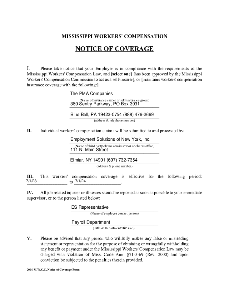 MISSISSIPPI WORKERS\' COMPENSATIONNOTICE OF COVERAGE I.Please take notice that your Employer is in compliance with the requirements of the Mississippi Workers\' Compensation Law, and [select one]