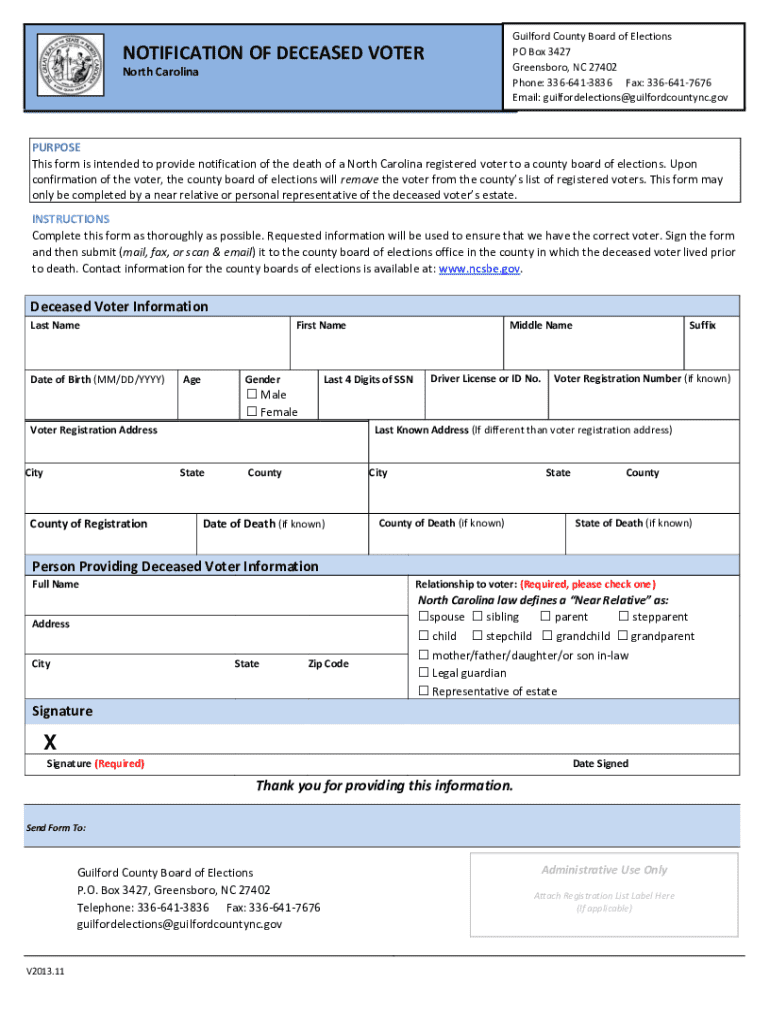 Guilford County Board of Elections PO Box 3427Greensboro, NC 27402 Phone: 3366413836 1 5224723Fax: 3366417676 91975Email: guilfordelections@guilfordcountync.gov @ncsbe.govNOTIFICATION OF DECEASED