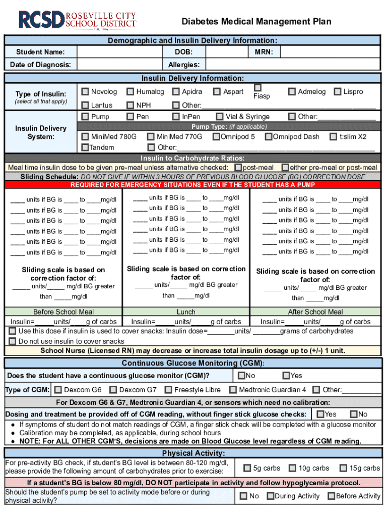 Diabetes Medical Management Plan Demographic and Delivery Information: Student Name:DOB:Date of Diagnosis:Allergies:MRN: NovologHumalogApidraAspartAdmelogLispro FiaspLantusNPHOther:___PumpPenInPenVial