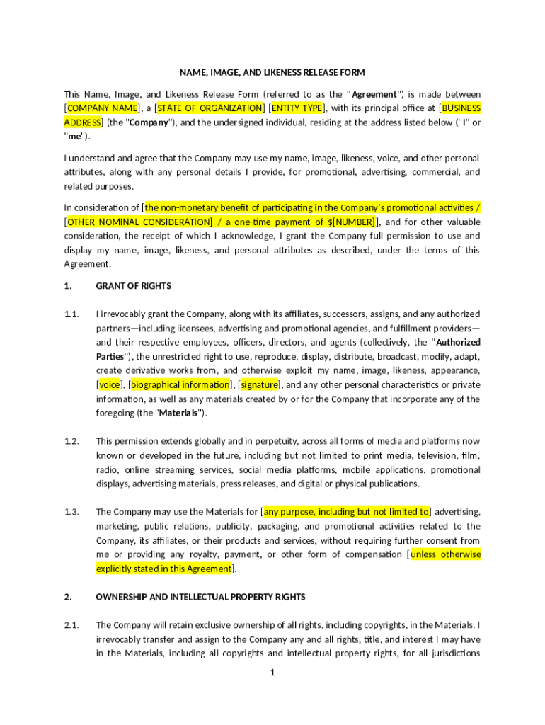 Specific clauses must also be included, such as the scope of rights granted, compensation agreements, and any limitations or restrictions on use. For example, if the release only applies to specific ad campaigns, that limitation should be made clear.