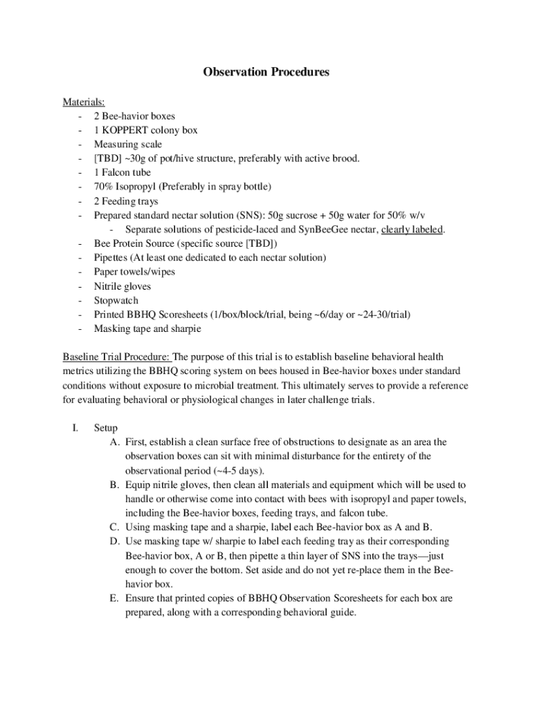 Observation Procedures Materials:2 Beehavior boxes1 KOPPERT colony boxMeasuring scale[TBD] 30g of pot/hive structure, preferably with active brood.1 Falcon tube70% Isopropyl (Preferably in spray bottle)2