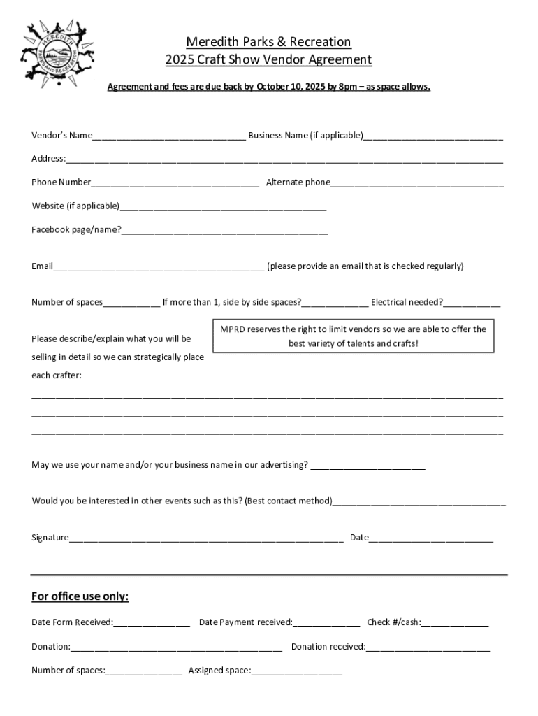 The Annual Meredith Craft Fair Form plays a central role in the seamless execution of this highly awaited event. Designed for ease of use, this form facilitates vendor registration and enables effective coordination of pre-event logistics. By taking the time to fill out the form accurately, vendors ensure their experience at the fair is smooth and rewarding.
