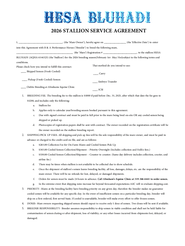 2026 STALLION SERVICE AGREEMENT I, ___, (the Mare Owner), hereby agree on ___ (the Effective Date) to enter into this Agreement with B & A Performance Horses (Breeder) to breed the following mare,