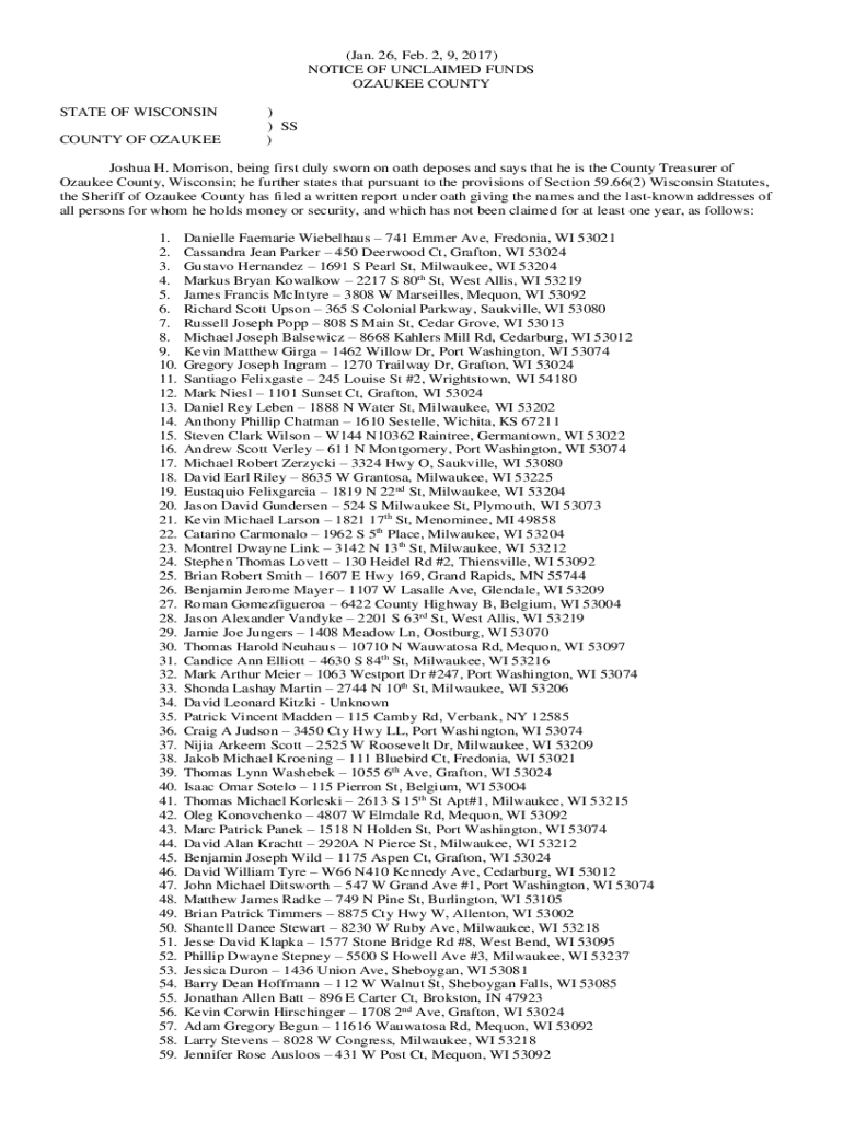 Get the free notice of unclaimed funds ozaukee county state of wisconsin