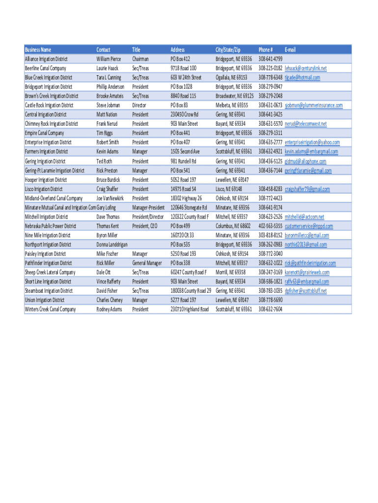Business Name Contact Alliance Irrigation District William Pierce Beerline Canal Company Laurie Haack Blue Creek Irrigation District Tara L Canning Bridgeport Irrigation District Phillip Anderson