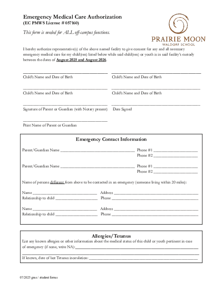 Emergency Medical Care Authorization (EC PMWS License # 057160)This form is needed for ALL offcampus functions. I hereby authorize representative(s) of the above named facility to give consent for