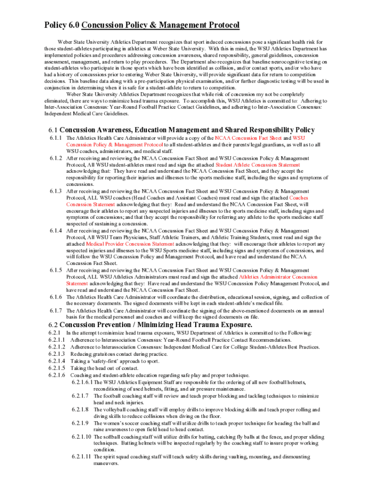 Policy 6.0 Concussion Policy & Management Protocol Weber State University Athletics Department recognizes that sport induced concussions pose a significant health risk for those studentathletes participating