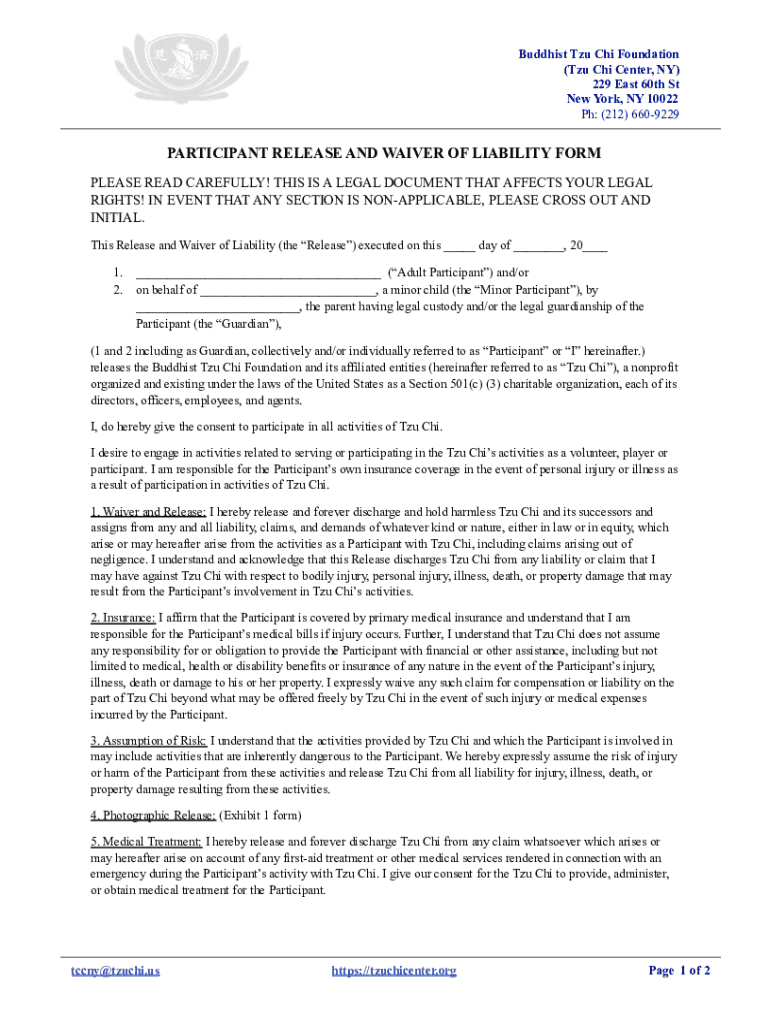Get the free Buddhist Tzu Chi Foundation PARTICIPANT RELEASE AND WAIVER OF LIABILITY FORM202211