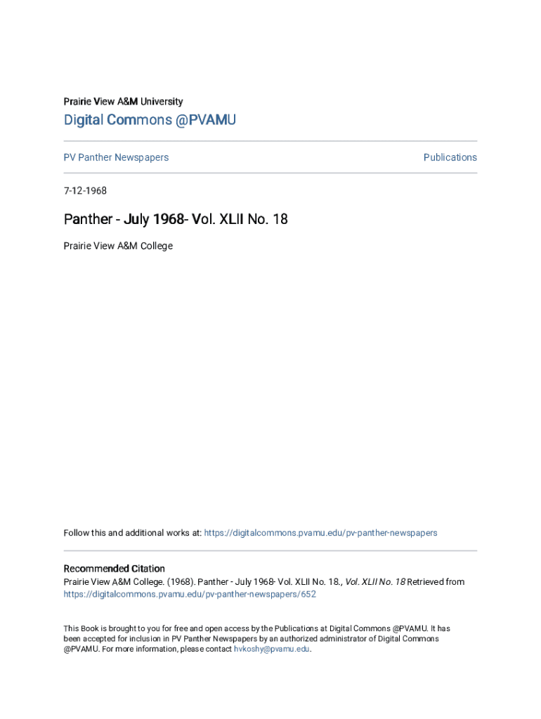 Prairie View A&M UniversityDigital Commons @PVAMU PV Panther NewspapersPublications7121968PantherJuly 1968 Vol. XLII No. 18 Prairie View A&M CollegeFollow this and additional works at: https://digitalcommons.pvamu.edu/pvpanthernewspapersRecommended