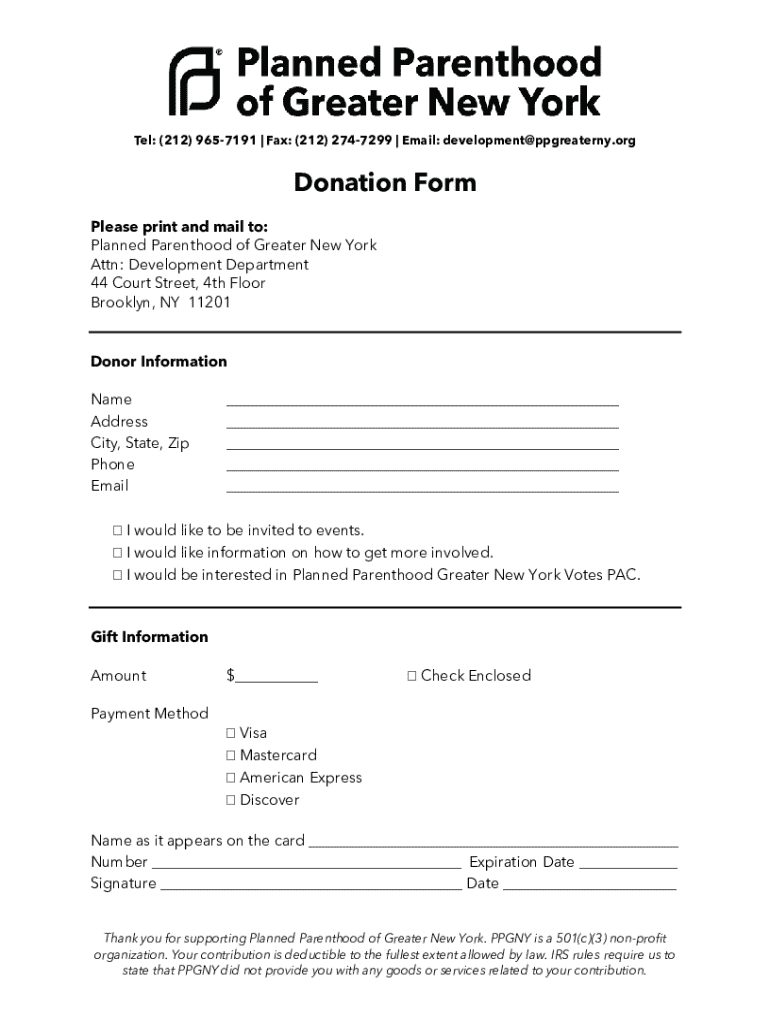 Tel: (212) 9657191 | Fax: (212) 2747299 | Email: development@ppgreaterny.orgDonation Form Please print and mail to: Planned Parenthood of Greater New York Attn: Development Department 44 Court Street,