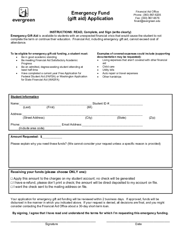 Emergency Fund (gift aid) ApplicationFinancial Aid Office Phone: (360) 8676205 Fax: (360) 8676576 finaid@evergreen.eduINSTRUCTIONS: READ, Complete, and Sign (write clearly) Emergency Gift Aid is available