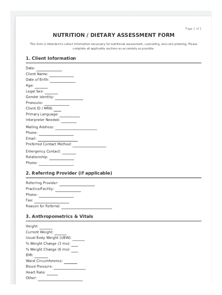 A dietary assessment form is a document used to evaluate an individual's dietary habits, nutritional intake, and overall health related to food consumption.