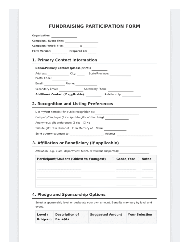 A fundraising participation form is a document used to collect information from individuals or organizations who wish to participate in a fundraising campaign or event.