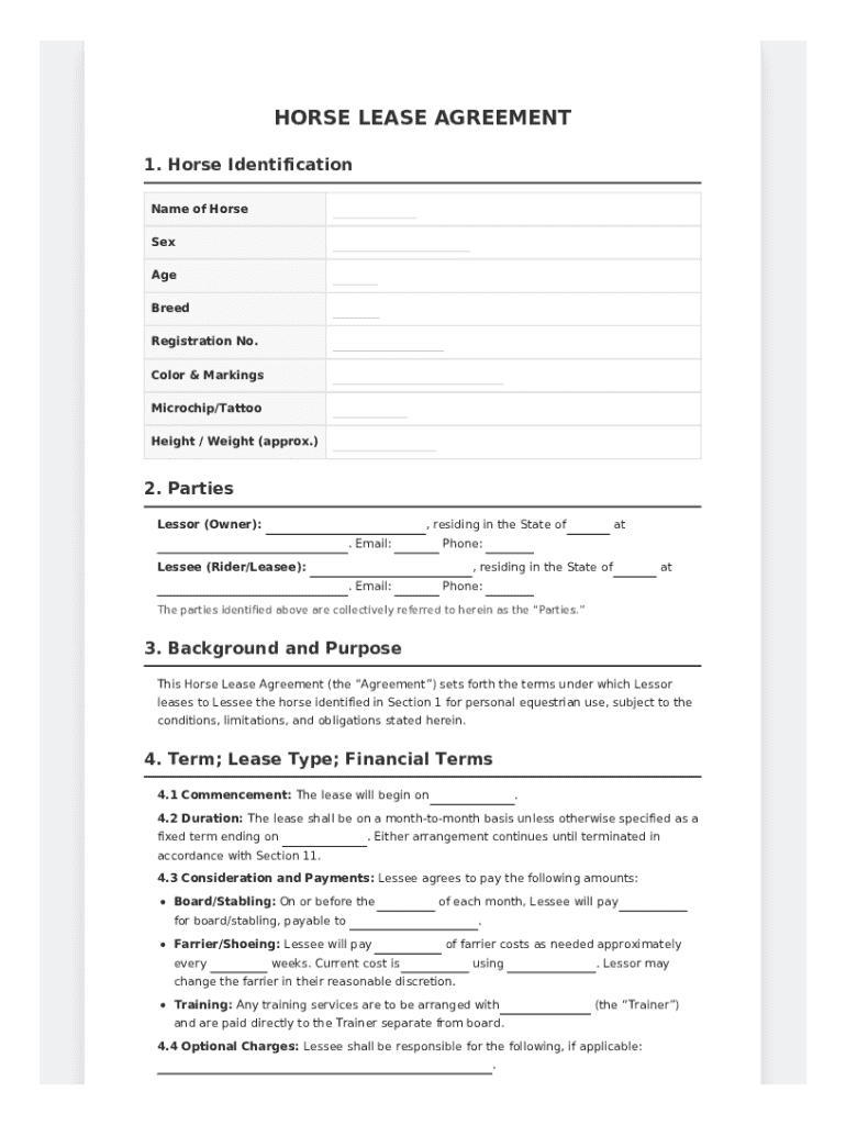 A horse lease agreement is a legal document that outlines the terms under which one party (the lessee) can use a horse owned by another party (the lessor). These agreements serve to formalize arrangements, providing clarity on both parties' roles and responsibilities, thereby protecting their interests.