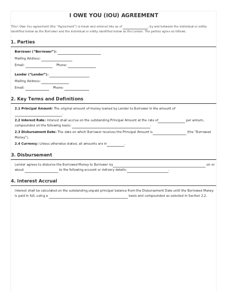 An IOU, or 'I Owe You,' is a simple document acknowledging a debt between two parties. It does not require formal signatures or notarization, but understanding its legal implications is crucial. An IOU agreement cuts down misunderstandings by clearly stating what is owed, thus protecting both borrower and lender.